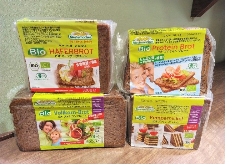 どれも栄養豊富でライ麦パン特有の奥深い味わいが楽しめますよ。特に「ビオプロテインブロート」はたんぱく質やばくないですか?卵やハムなど追加しなくてもこれだけで十分なたんぱく質が摂れます。