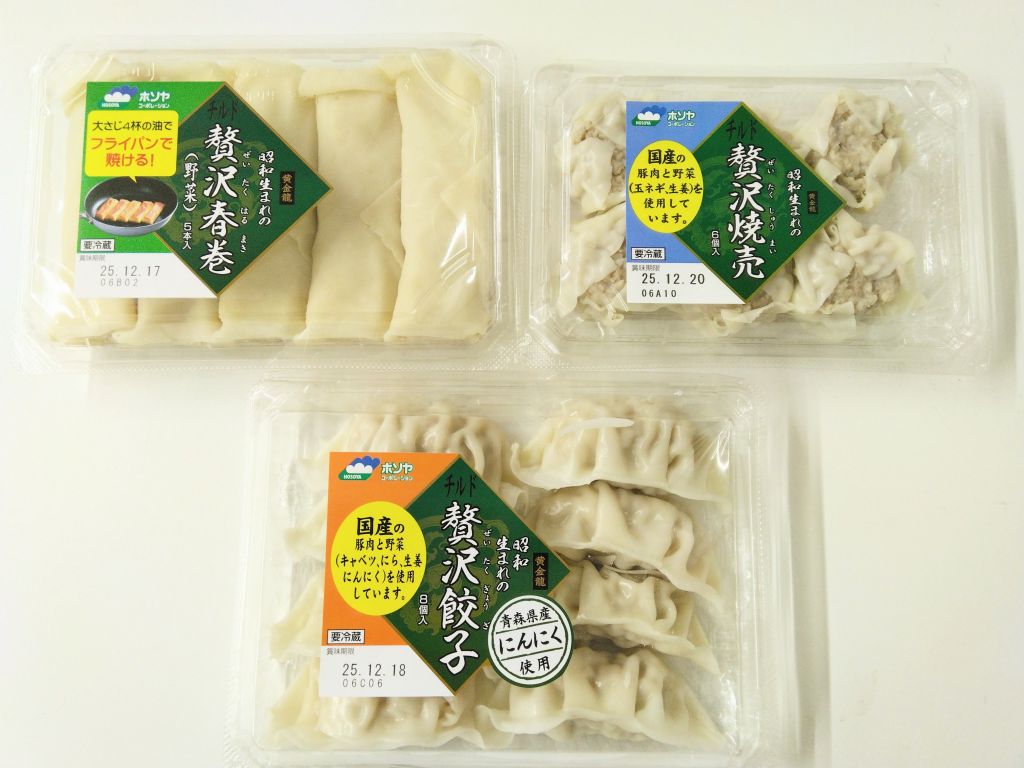 「ホソヤコーポレーション」の贅沢シリーズ。餃子、春巻、焼売です!国産の豚肉、野菜を使用しています。どれもオススメ。