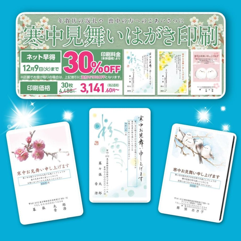 「寒中見舞いはがき印刷」はインターネットでのお申し込みが大変お得です♪12月9日(火)まで『ネット早得30%OFF』となっておりさらに店舗での受け取りにして頂くと追加10%OFFの「40%OFF」となります。