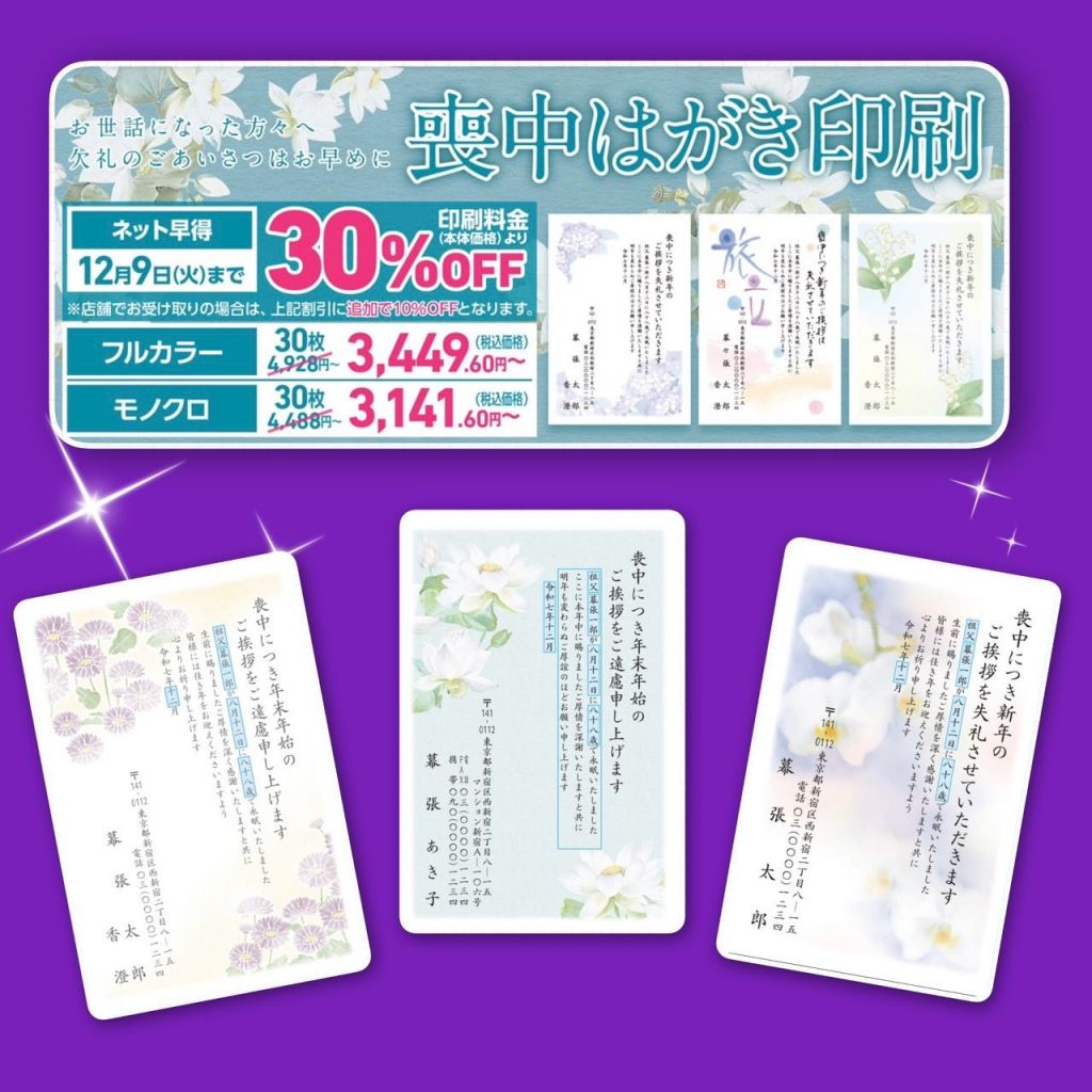 インターネットでの「喪中はがき印刷」のお申し込みが大変お得です。『ネット早得30%OFF』が12月9日(火)までとなっております。さらに店舗での受取りで追加の割引10%OFFで「40%OFF」になります♪
