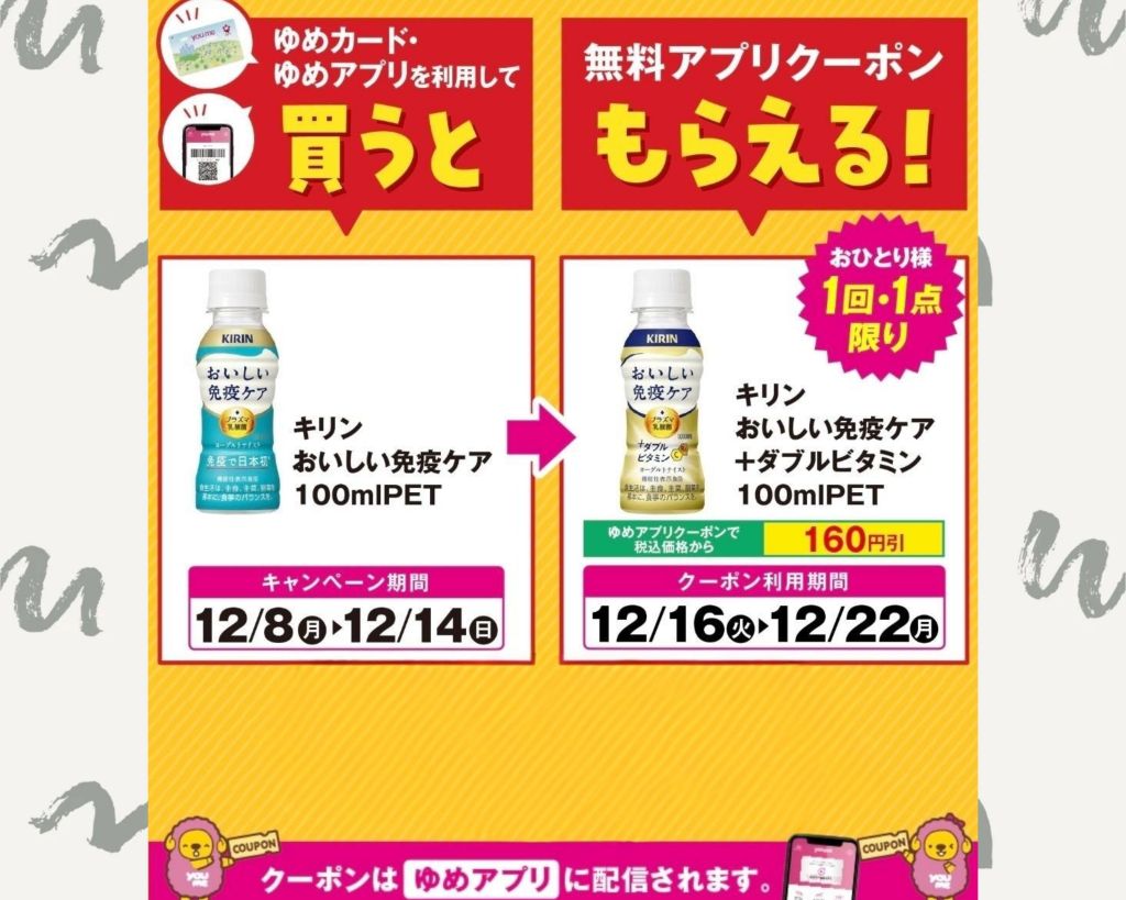 こちらの商品を12/8(月)~12/14(日)の期間中ゆめカード・ゆめアプリを利用して購入しますと、【おいしい免疫ケア+ダブルビタミン】の無料アプリクーポンが貰えます!