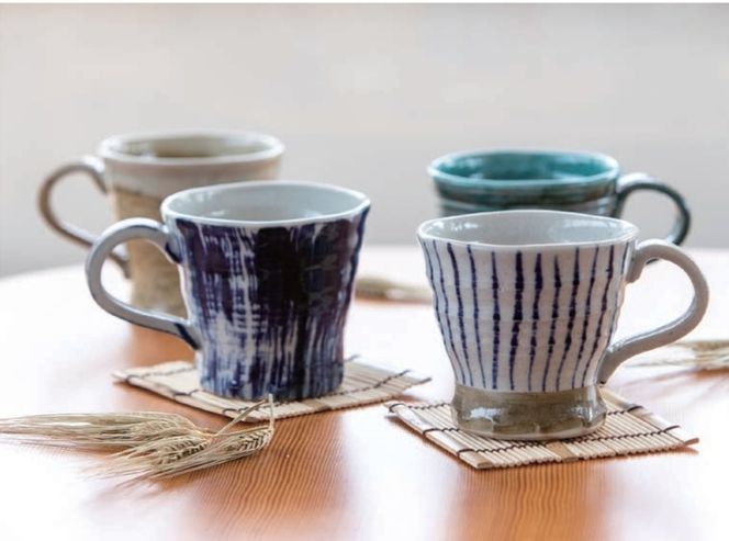 同じシルエットのマグに違った表情を模様しました。削りや刷毛、釉薬など一つ一つの個性が光るデザイン。焼き物を愉しみたい方におすすめです。