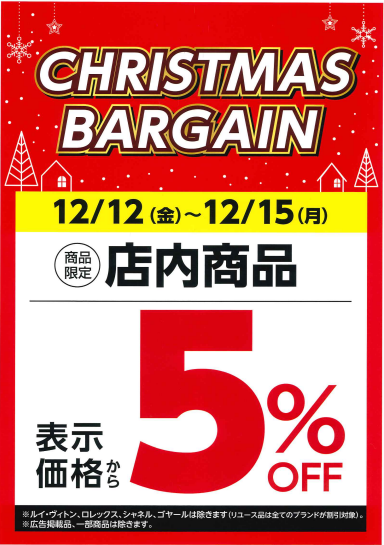 店内商品全品表示価格から5%OFFクリスマスバーゲンセールを開催いたします。