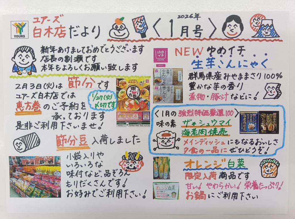 ユアーズ白木店店長の割瀬です 今月のユアーズ白木店だよりを発行しました 節分準備、おすすめ商品などのご紹介をさせていただいております 是非ご覧ください