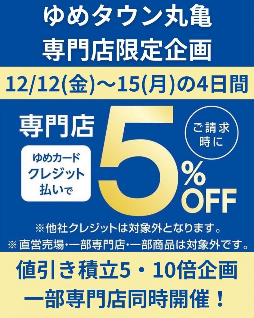 期間中にゆめタウン丸亀専門店でゆめカードクレジットでお支払いいただくと請求時に5%OFFになります!