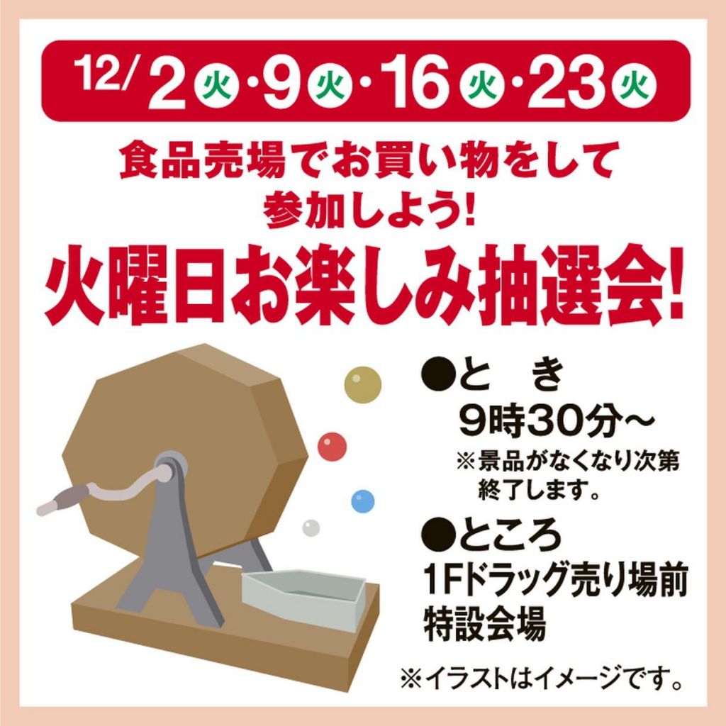 ※12/30(火)の火曜日抽選会はお休みさせていただきます。 1月は1/6(火)から開催を予定しております。