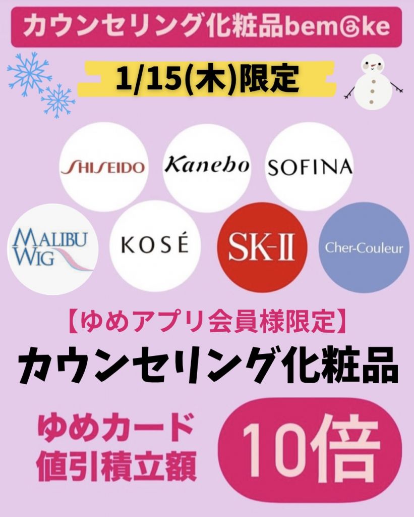 ゆめアプリ会員様限定カウンセリング化粧品10倍セールのご案内です!