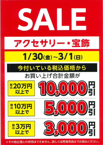 3/1(日)までの期間限定でアクセサリー・宝飾がお買上金額に応じて割引になります。