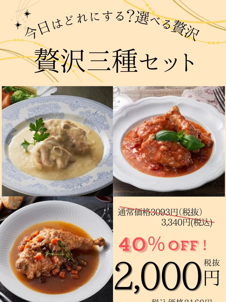 トマト・クリーム・赤ワインの3つのソースが一度に楽しめる、贅沢で満足感のあるセットです♪
