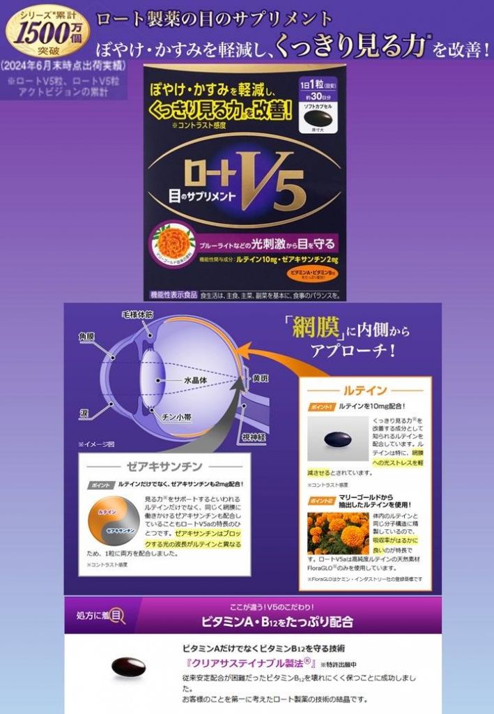 ロートV5はくっきり見る力のコントラスト感度を改善することが報告されている成分ルテイン・ゼアキサンチンを含有します。