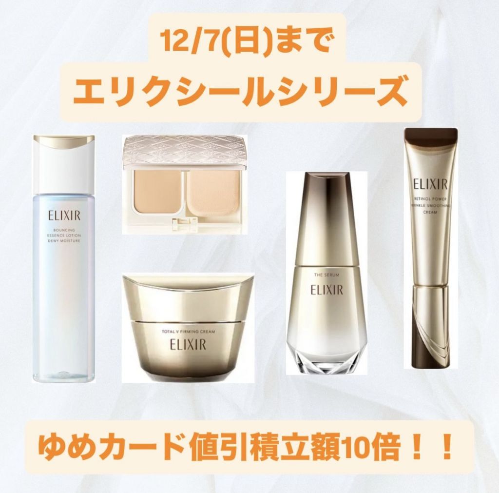 12/4(木)~12/7(日)までの期間、エリクシールシリーズ全品ゆめカード値引積立額10倍!!