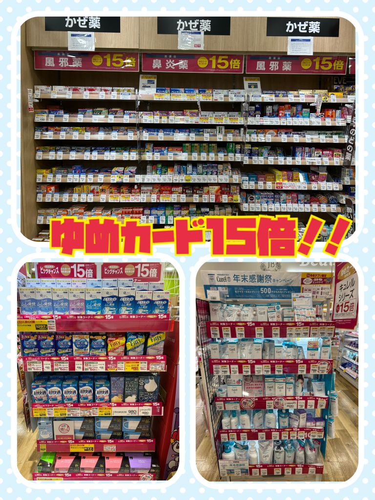医薬品コーナーでは、風邪薬、鎮痛剤・酔い止め薬、胃腸・整腸・便秘薬、漢方薬、皮膚薬が全品ゆめカード値引き積立額15倍。