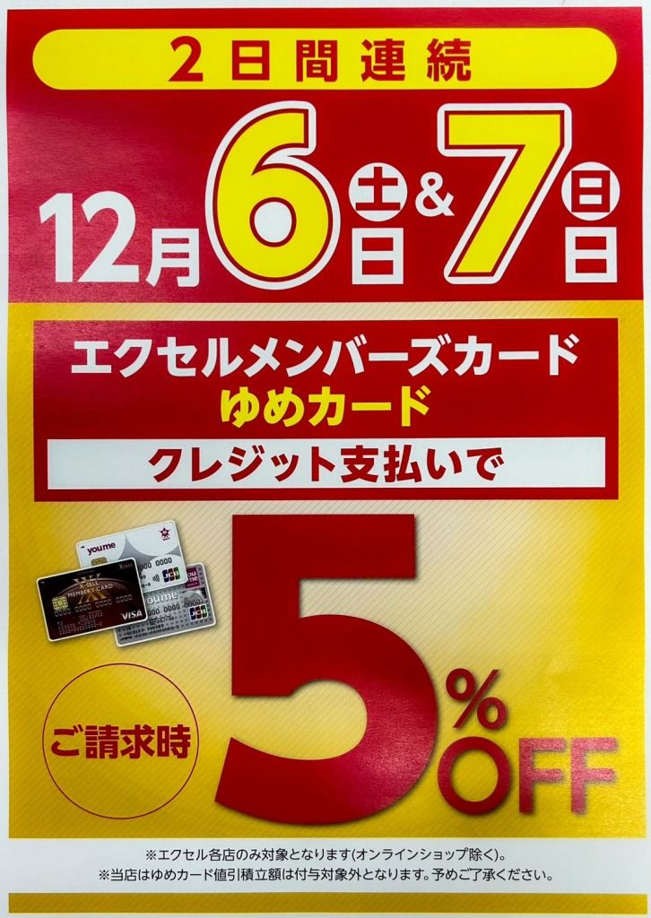 店内でのお会計時、ゆめカードクレジット・エクセルメンバーズクレジットでお買い物をされますと請求時5%OFFとなる月に1度のキャンペーンとなっております。