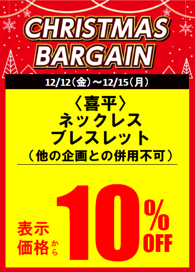 12/12(金)~15(月)の4日間限定で喜平のブレスレット、ネックレスが10%OFFと大変お買得です。