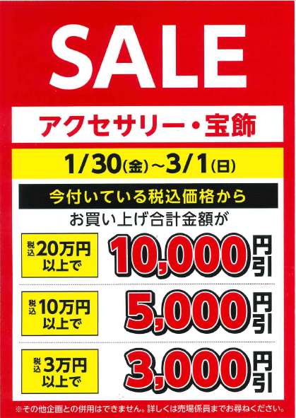 アクセサリー・宝飾のコーナーでは、1/30(金)~3/1(日)の期間中、今付いている税込価格からお買上げ合計金額に応じて、お値引きさせて頂きます。