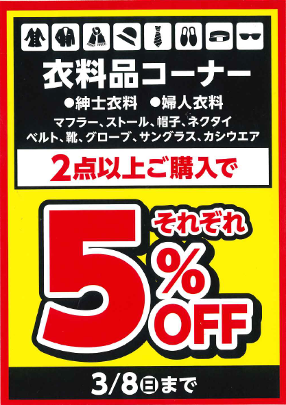 3/8(日)まで衣料品コーナーでは、紳士・婦人衣料、マフラー、帽子、ネクタイ、ベルト、靴、手袋、サングラス、カシウエアが2点以上ご購入で、それぞれ5%OFFと大変お買得になっております。