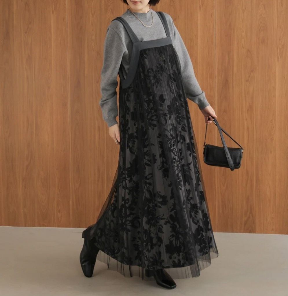 フロッキープリントの花柄にチュールを重ね、深みのある表情を演出★