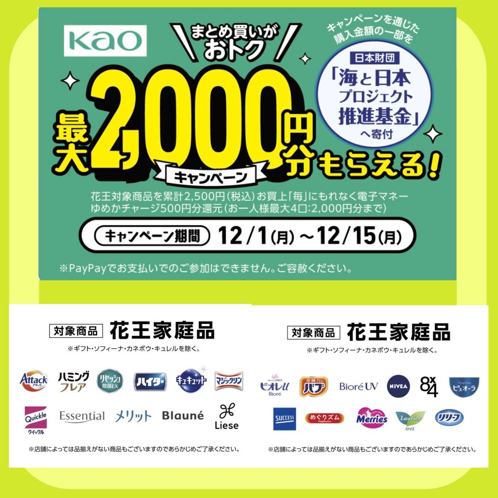花王の対象商品をゆめタウンで累計2500円(税込)お買い上げ毎にゆめかチャージが500円還元されます!