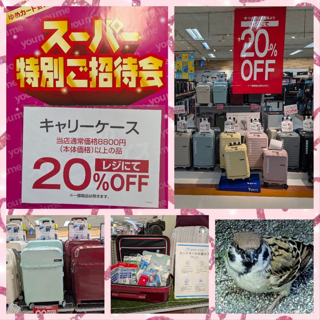 12/15(月)まで、本体価格8,800円以上のキャリーケースを、レジにて20%オフでご奉仕いたします。