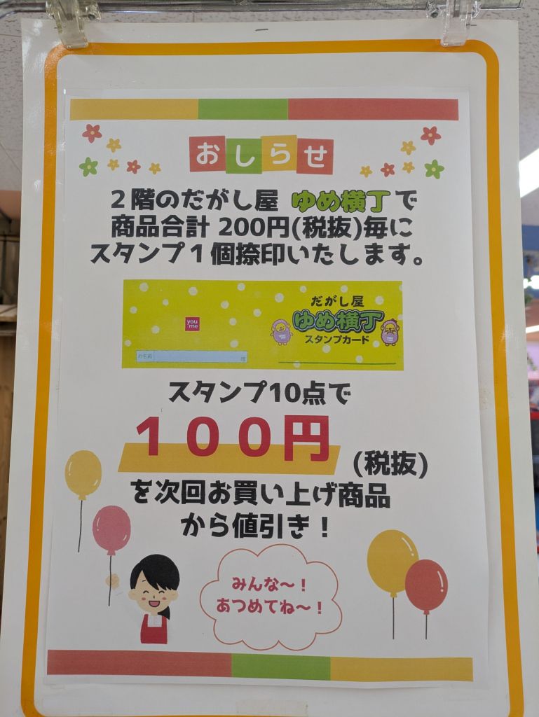 なんと次回のお買い上げで、スタンプカードを掲示して頂くと、100円(税抜き)の値引きを致します。