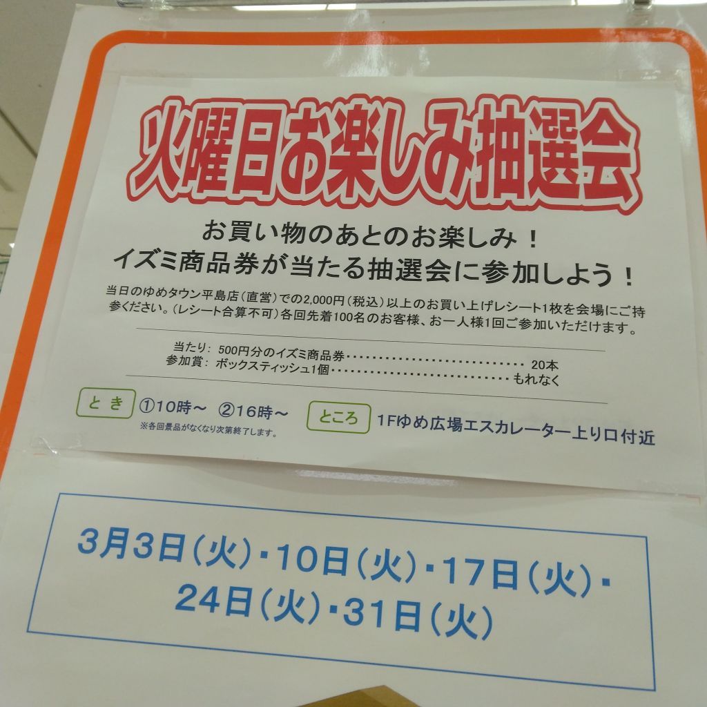 500円のイズミ商品券、もしくはボックスティッシュ1個が当たります。