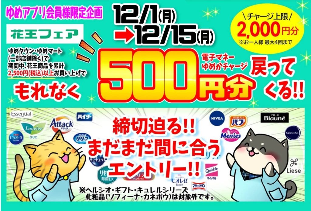 花王商品を期間中累計税込2500円以上お買い上げで、電子マネーゆめかチャージ500円還元!