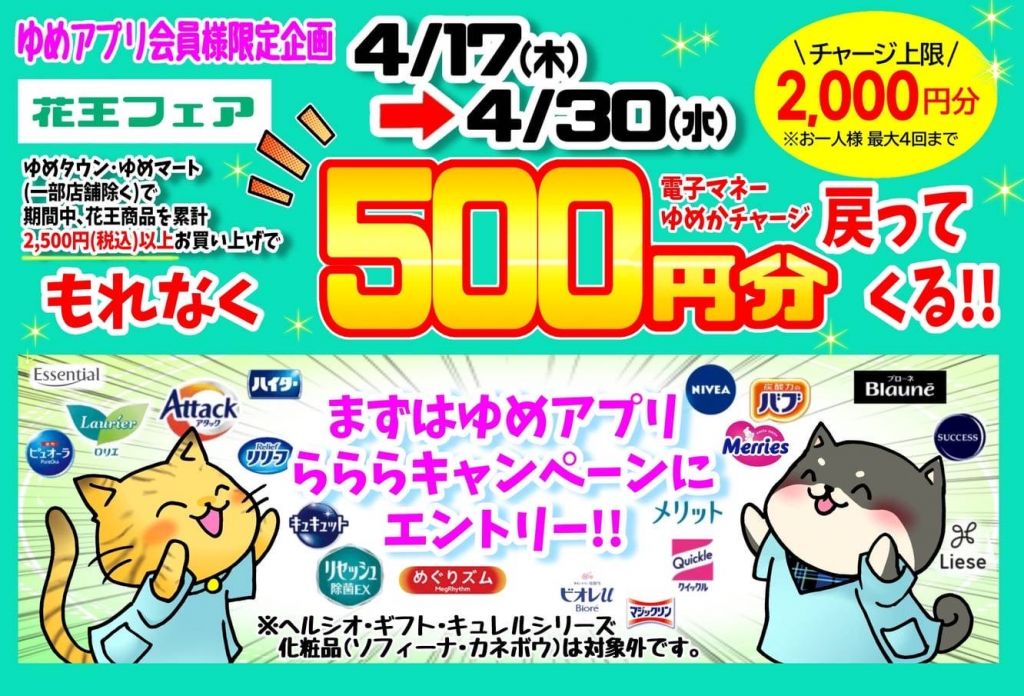 花王商品を期間中累計税込2500円以上お買い上げで、電子マネーゆめかチャージ500円還元!