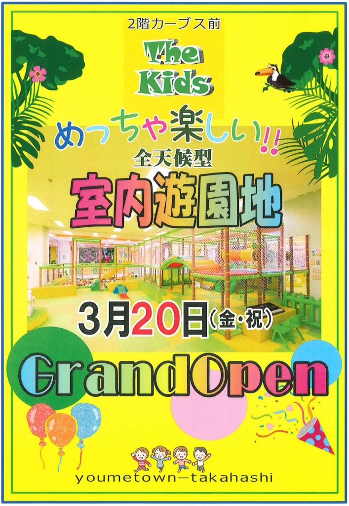 ゆめタウン高梁に全天候型・室内遊園地【ザ・キッズ】グランドオープン!! イートインスペースもあってご家族で楽しめます♪ 営業時間は、 平日 10:00~18:00(最終受付17:30) 土日祝 10:00~19:00 (最終受付18:30) ぜひ皆様でご来店ください♪