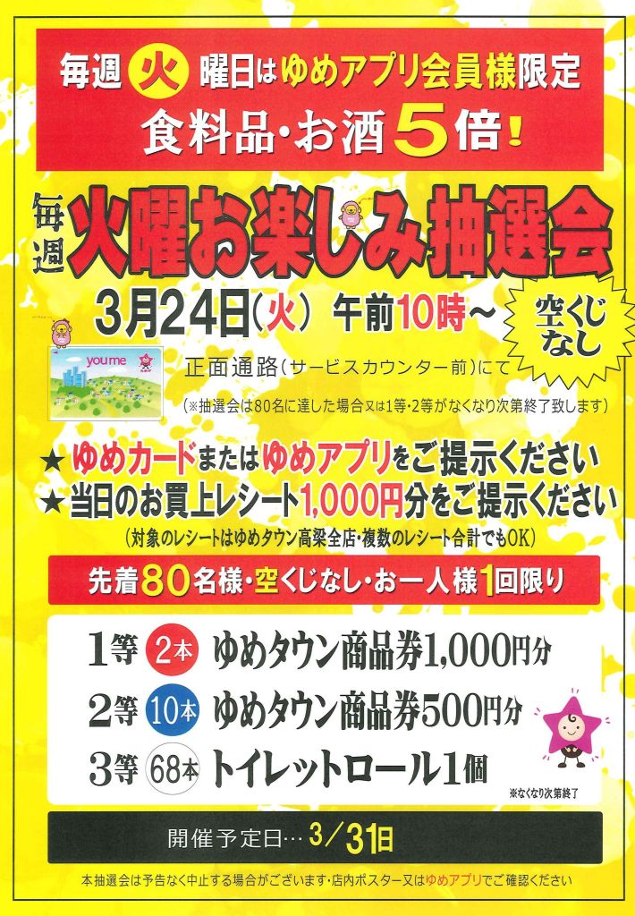 ゆめタウン高梁・火曜日恒例【お楽しみ抽選会】を開催!! ゆめカードのご提示とお買上げレシート1,000円分で参加できます。 無くなり次第終了となりますのでお早めに…!!