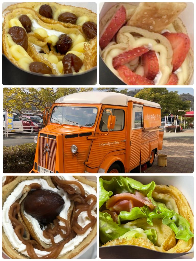 こんにちは♪ 12/9(火)・10(水)の2日間 可愛いオレンジトラックのクレープ屋さん 「ラ・ムソン・カフェ」が営業します♪ 10:00~19:00 正面入口横 人気のチョコバナナ生クリームや 生苺のレアチーズクリーム、モンブラン、 ラムレーズン、ベーコンマヨネーズなど 豊富なメニューでお待ちしています♪ お買い物の後は美味しいクレープ 買いに来てくださいね(^O^)/ ※お買い物前に注文しておけば 待たずに受け取れますよ