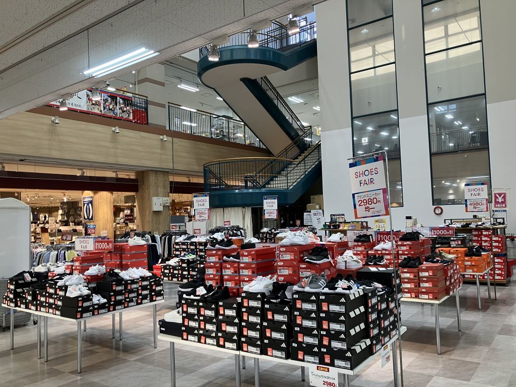 2階 シューズコーナーも同時開催中です。お買い得商品を多数品揃え致しております。