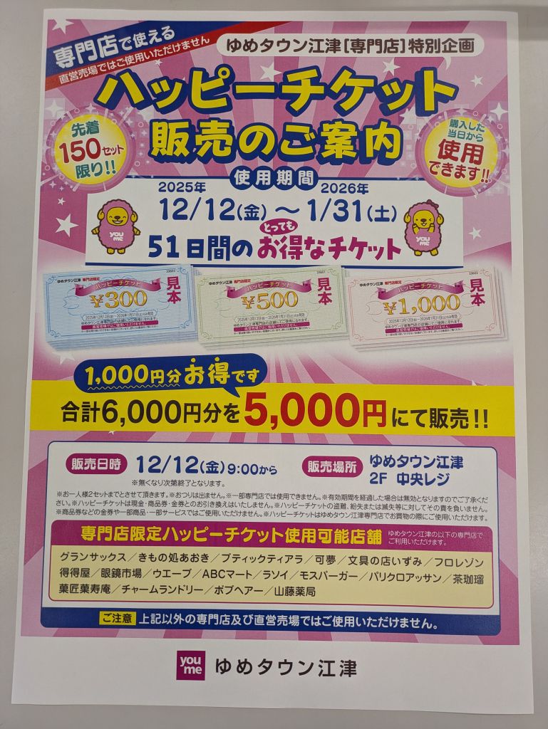 ゆめタウン江津の専門店で使える「ハッピーチケット」販売いたします!