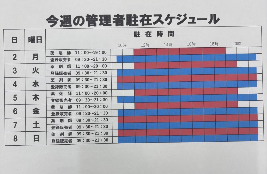 一階薬品コーナーより今週の管理者駐在スケジュールのご案内です。ロキソニン、ガスター、リアップ、抗原検査キット等の第一類医薬品・要指導医薬品をお買い求めのお客様は、赤の薬剤師駐在時間内にご来店くださいませ。