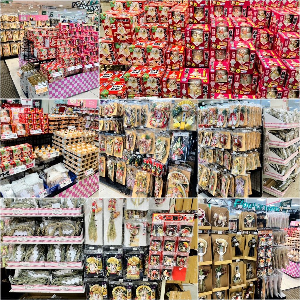 イオン酒田南店の1階の正面入口のところにおいて、鏡餅やしめ飾りなどいろいろご提案をしております。