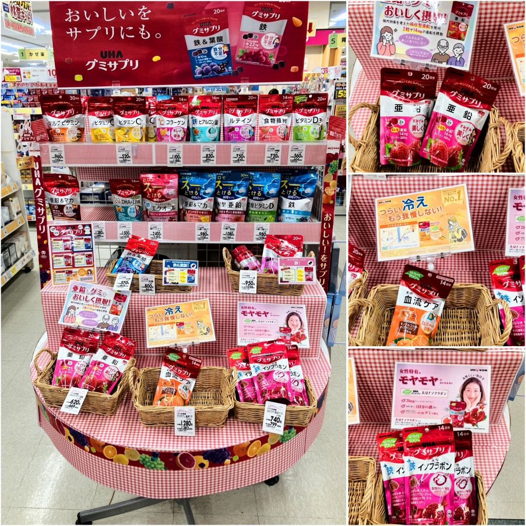 イオン酒田南店の1階のお薬コーナーのところでは、グミサプリの提案をしております。