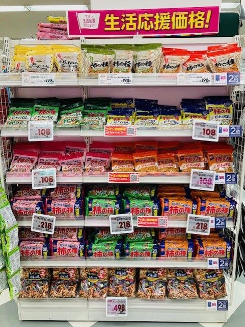 イオン酒田南店の1階の食品売場の菓子のコーナーでは、豆菓子の提案も実施しております。