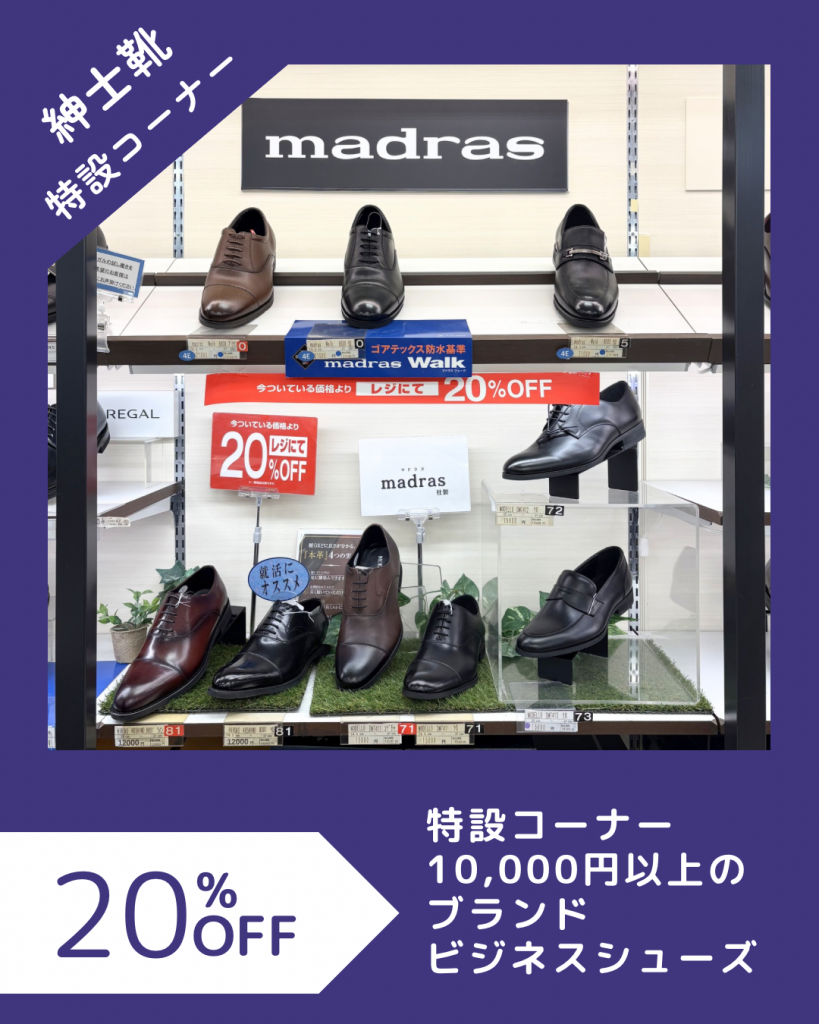 本体価格10,000円以上のブランドビジネスシューズとビジカジシューズがレジにて20%OFFと大変お買い得!