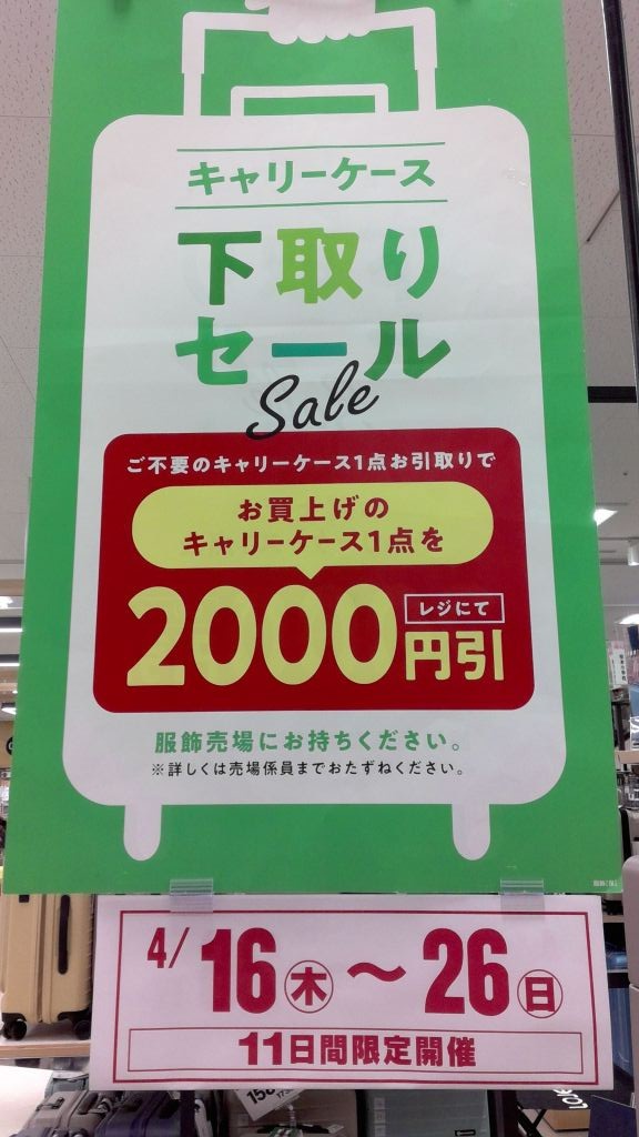 期間中、新しい(税込)8800円以上のキャリーケースをご購入いただいたお客様対象に、今お使いのスーツケースを2000円で下取り致します。