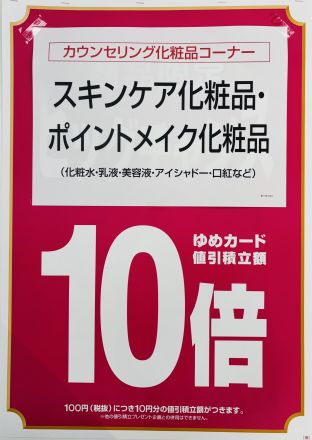 期間中は、資生堂・カネボウ・コーセー・ソフィーナ・カバーマーク・アクセーヌ・シェルクルールのメーク落とし・洗顔・化粧水・乳液・クリーム・美容液・アイシャドウ・口紅・チークなどゆめカード値引き積立額10倍です!
