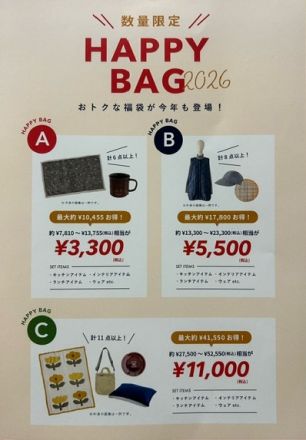 生活雑貨を中心に、今すぐ使えるあったか雑貨やキッチン雑貨、ルームシューズ、アロマ、バッグ、エプロンなどなど…盛りだくさんの内容です!毎年好評につき完売、2026年も特別な内容で準備しております!ご予約数量には限りがございます。ぜひお早めにご利用下さい。詳しくは店頭スタッフへお尋ねください(^^)