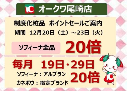 ポイントセールのご案内です! 下記の期間中ソフィーナ商品(全品)をご購入の方は ポイント20倍になります!! 【実施期間】 ☆12/20(土)〜23(火) また、毎月19日・29日は ポイント20倍!! 【ソフィーナ】アルブラン 【カネボウ】指定ブランド 是非この機会にお買い求めくださいませ。 詳しくは係員までお問合せください。 みなさまのご来店お待ちしております(*^▽^*)