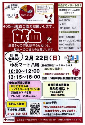 2月22日(日)10:00〜12:00、13:15〜16:00ゆめマート八幡にて「献血」を行います。 患者さんの命を守るためにも、献血へのご協力お願い致します。