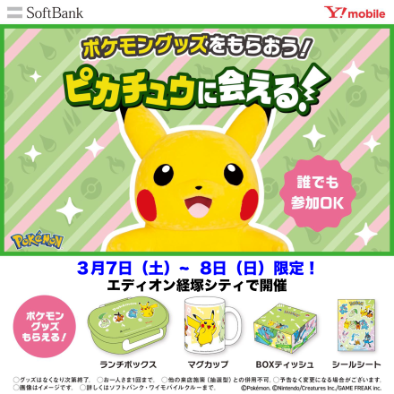 3/7(土)・3/8(日)経塚シティエディオンケータイコーナーにピカチュウがやってきます♪ 場所:エディオン経塚シティケータイコーナー 登場時間: ①11:30〜 / ②13:00〜 / ③14:30〜 / ④16:00〜 / ⑤17:30〜 (各回30分程度) ポケモングッズのプレゼントも行っています! 経塚シティでピカチュウに会えるのはこの2日間だけ! ぜひ会いに来てくださいね♪