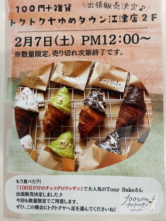 こんにちは 100円ショップ+雑貨のお店『トクトクヤ』です! 『100日だけのチョコクロワッサン』で大人気のTony Bakeさんの出張販売が決定しました♪ 数量限定、無くなり次第終了です。 ぜひ、この機会にトクトクヤへ足を運んでくださいね! 開催日時:2月7日(土)pm12時〜 開催場所:100円ショップトクトクヤ店内(2階)